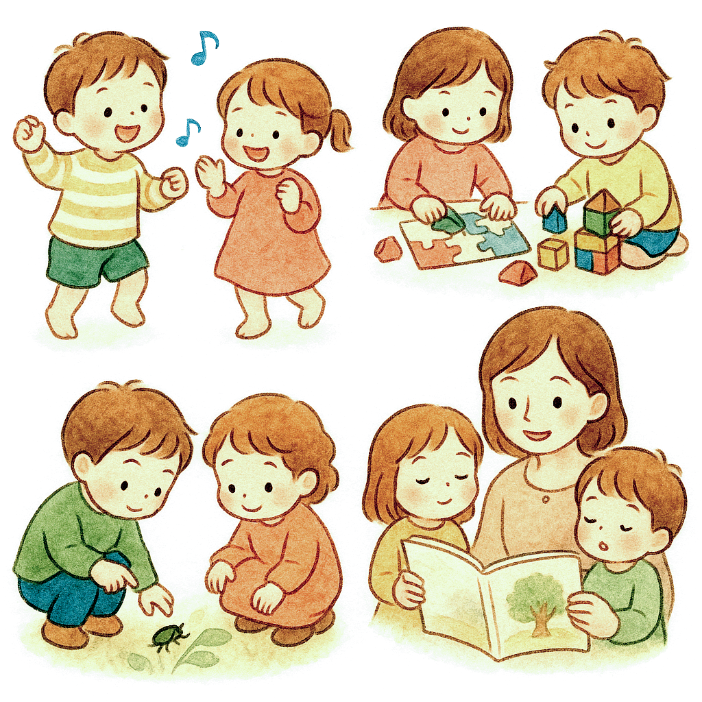 音楽に合わせて体を動かすことで、リズム感や表現力、協調性を育みます。
